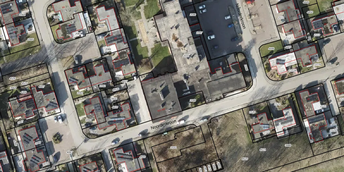 Het perceel waarop Noorderkroon 205 staat heeft een oppervlakte van 2253 m². Dit is een zeer groot perceel. De perceeloppervlakte wordt geregistreerd door het Kadaster. Gedetailleerde informatie over de maten van dit perceel kunt u vinden in het rapport Kadastrale kaart met maatvoering van Noorderkroon 205.