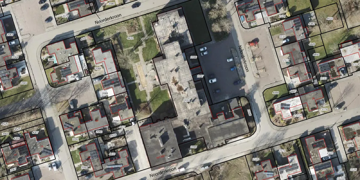 Het perceel waarop Noorderkroon 211 staat heeft een oppervlakte van 2253 m². Dit is een zeer groot perceel. De perceeloppervlakte wordt geregistreerd door het Kadaster. Gedetailleerde informatie over de maten van dit perceel kunt u vinden in het rapport Kadastrale kaart met maatvoering van Noorderkroon 211.