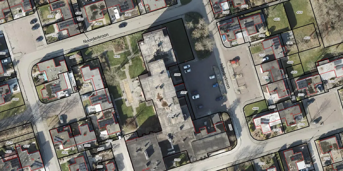 Het perceel waarop Noorderkroon 221 staat heeft een oppervlakte van 2253 m². Dit is een zeer groot perceel. De perceeloppervlakte wordt geregistreerd door het Kadaster. Gedetailleerde informatie over de maten van dit perceel kunt u vinden in het rapport Kadastrale kaart met maatvoering van Noorderkroon 221.