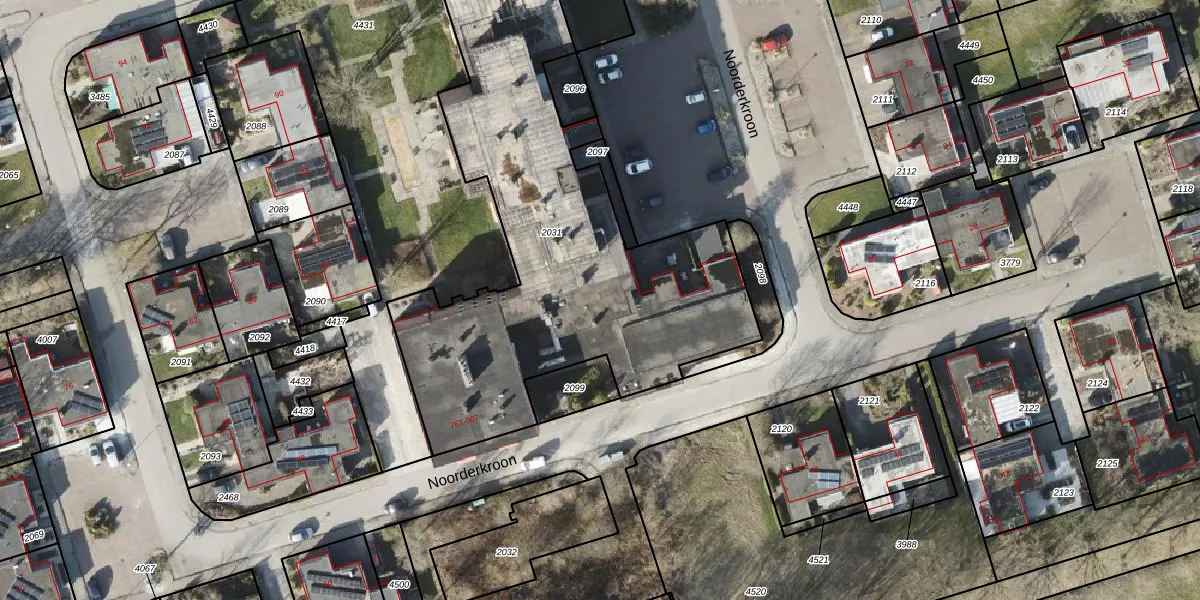 Het perceel waarop Noorderkroon 404 staat heeft een oppervlakte van 2253 m². Dit is een zeer groot perceel. De perceeloppervlakte wordt geregistreerd door het Kadaster. Gedetailleerde informatie over de maten van dit perceel kunt u vinden in het rapport Kadastrale kaart met maatvoering van Noorderkroon 404.