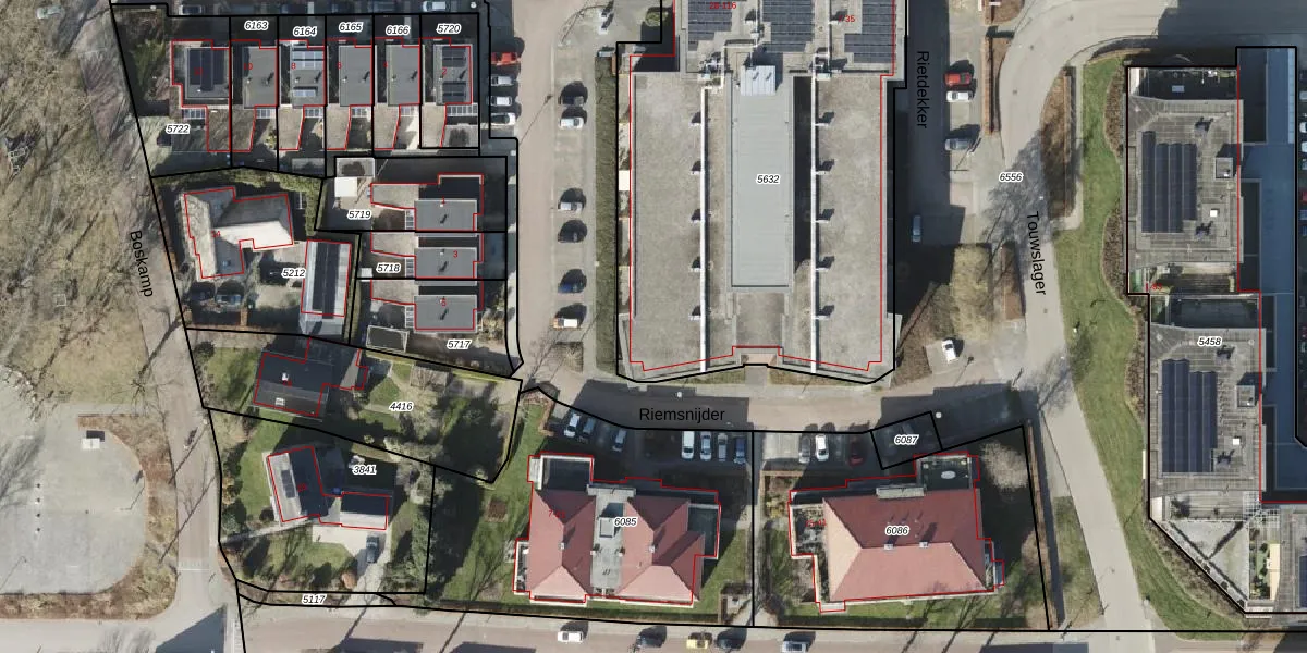 Het perceel waarop Riemsnijder 54 staat heeft een oppervlakte van 3279 m². Dit is een zeer groot perceel. De perceeloppervlakte wordt geregistreerd door het Kadaster. Gedetailleerde informatie over de maten van dit perceel kunt u vinden in het rapport Kadastrale kaart met maatvoering van Riemsnijder 54.