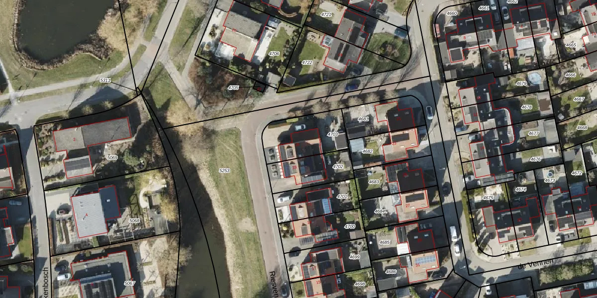 Het perceel waarop Riesven 25 staat heeft een oppervlakte van 377 m². Dit is een groot perceel. De perceeloppervlakte wordt geregistreerd door het Kadaster. Gedetailleerde informatie over de maten van dit perceel kunt u vinden in het rapport Kadastrale kaart met maatvoering van Riesven 25.