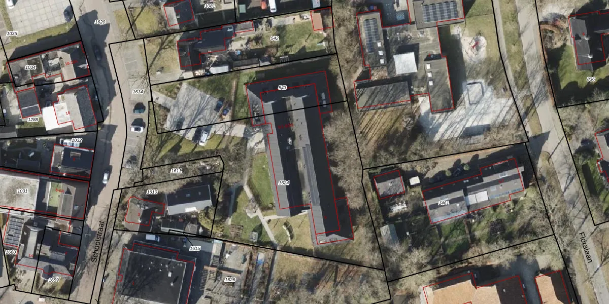 Schoolstraat 5-11 is gelegen op kadastraal perceel RDN01M1624. Deze kadastrale aanduiding is uniek en wordt gebruikt door het Kadaster om eigendomsrechten en andere zakelijke rechten vast te leggen. Het perceel maakt onderdeel uit van de kadastrale gemeente Roden.