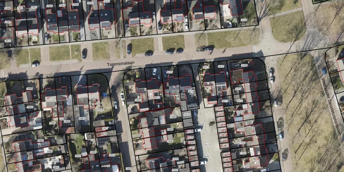 Torensmalaan 10 is gelegen op kadastraal perceel RDN01I5075. Deze kadastrale aanduiding is uniek en wordt gebruikt door het Kadaster om eigendomsrechten en andere zakelijke rechten vast te leggen. Het perceel maakt onderdeel uit van de kadastrale gemeente Roden.