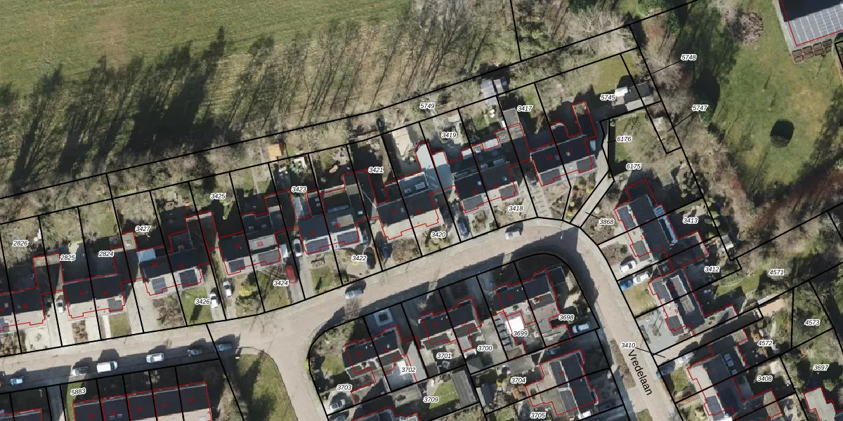 Vredelaan 25 is gelegen op kadastraal perceel RDN01I3420. Deze kadastrale aanduiding is uniek en wordt gebruikt door het Kadaster om eigendomsrechten en andere zakelijke rechten vast te leggen. Het perceel maakt onderdeel uit van de kadastrale gemeente Roden.
