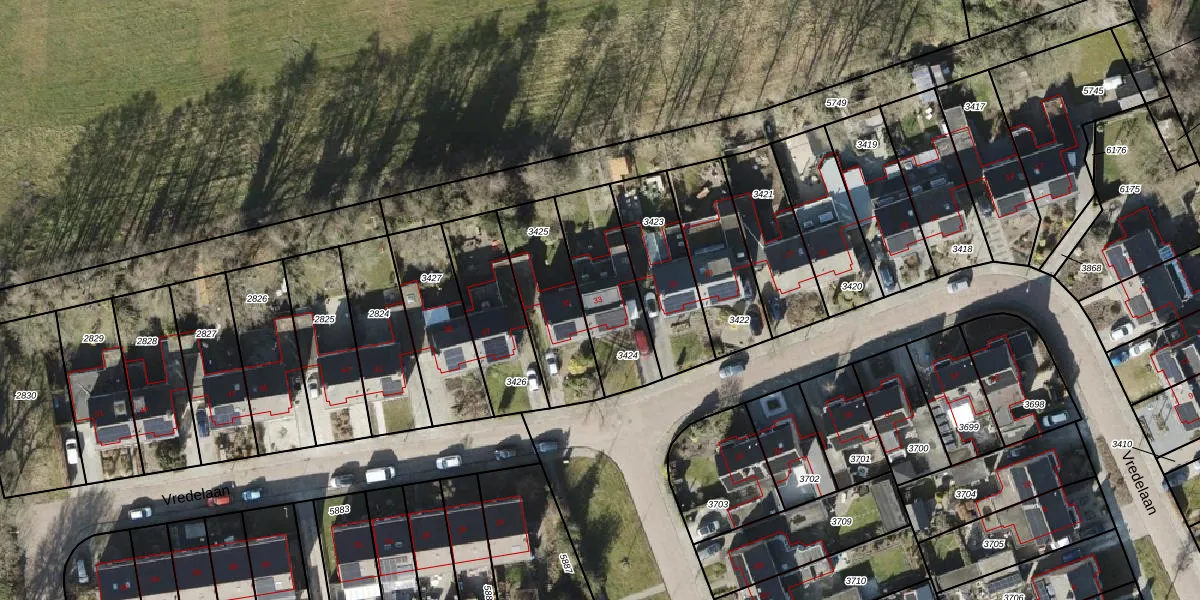 Vredelaan 33 is gelegen op kadastraal perceel RDN01I3424. Deze kadastrale aanduiding is uniek en wordt gebruikt door het Kadaster om eigendomsrechten en andere zakelijke rechten vast te leggen. Het perceel maakt onderdeel uit van de kadastrale gemeente Roden.