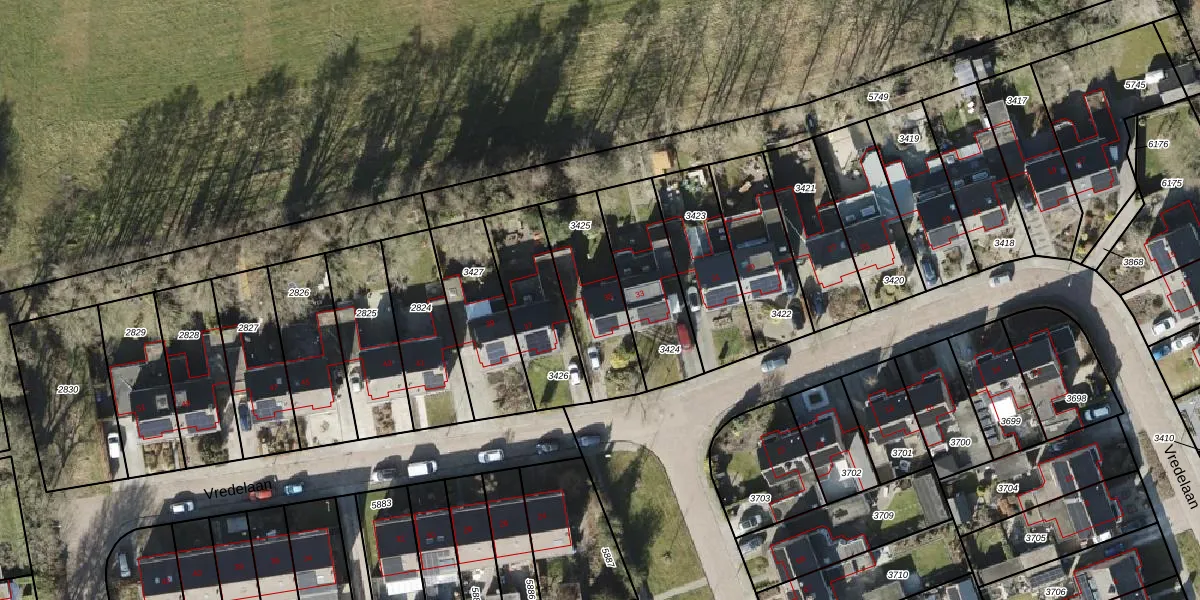 Vredelaan 35 is gelegen op kadastraal perceel RDN01I3425. Deze kadastrale aanduiding is uniek en wordt gebruikt door het Kadaster om eigendomsrechten en andere zakelijke rechten vast te leggen. Het perceel maakt onderdeel uit van de kadastrale gemeente Roden.