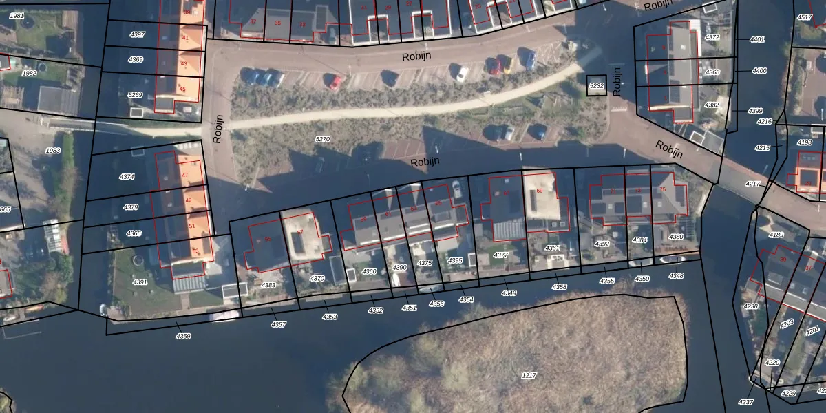 Robijn 63 is gelegen op kadastraal perceel AKM01K4375. Deze kadastrale aanduiding is uniek en wordt gebruikt door het Kadaster om eigendomsrechten en andere zakelijke rechten vast te leggen. Het perceel maakt onderdeel uit van de kadastrale gemeente Alkemade.