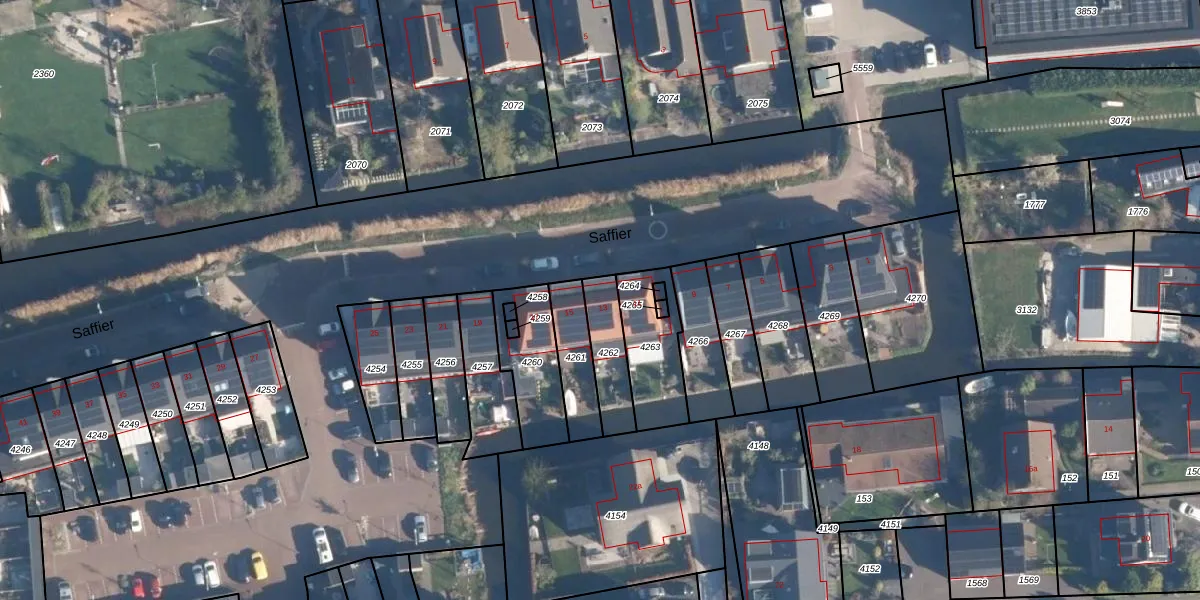 Het perceel waarop Saffier 13 staat heeft een oppervlakte van 150 m². Dit is een middelgroot perceel. De perceeloppervlakte wordt geregistreerd door het Kadaster. Gedetailleerde informatie over de maten van dit perceel kunt u vinden in het rapport Kadastrale kaart met maatvoering van Saffier 13.