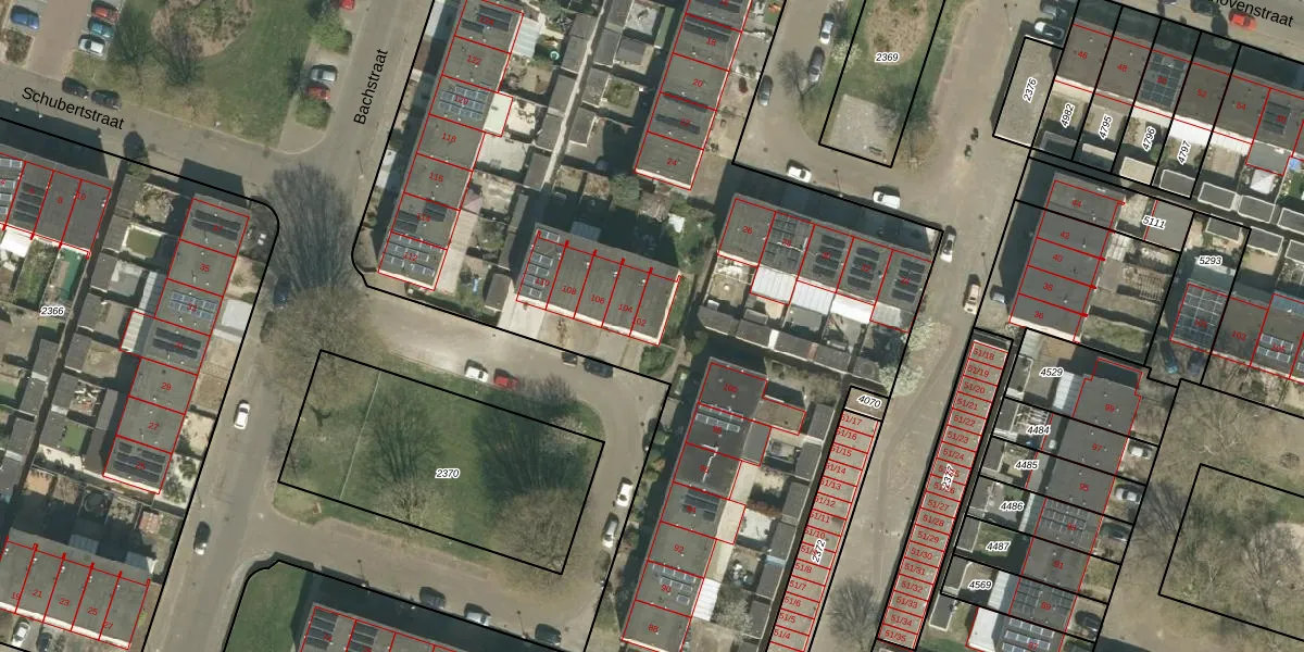 Bachstraat 102 is gelegen op kadastraal perceel RMD00F2371. Deze kadastrale aanduiding is uniek en wordt gebruikt door het Kadaster om eigendomsrechten en andere zakelijke rechten vast te leggen. Het perceel maakt onderdeel uit van de kadastrale gemeente Roermond.