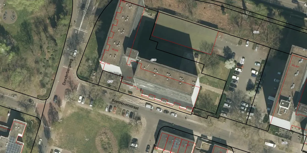 Het perceel waarop Beethovenstraat 165 staat heeft een oppervlakte van 3741 m². Dit is een zeer groot perceel. De perceeloppervlakte wordt geregistreerd door het Kadaster. Gedetailleerde informatie over de maten van dit perceel kunt u vinden in het rapport Kadastrale kaart met maatvoering van Beethovenstraat 165.