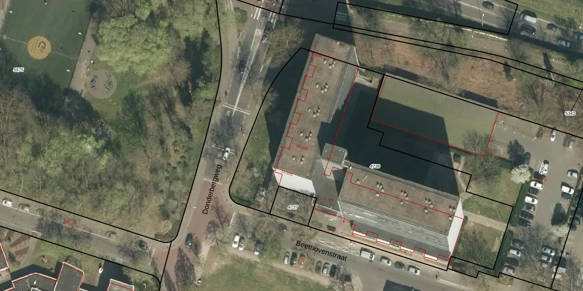 Het perceel waarop Beethovenstraat 23 staat heeft een oppervlakte van 3741 m². Dit is een zeer groot perceel. De perceeloppervlakte wordt geregistreerd door het Kadaster. Gedetailleerde informatie over de maten van dit perceel kunt u vinden in het rapport Kadastrale kaart met maatvoering van Beethovenstraat 23.