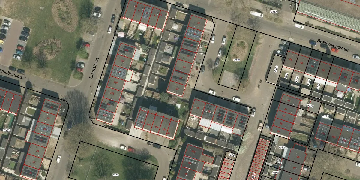 Het perceel waarop Beethovenstraat 24 staat heeft een oppervlakte van 1,1 ha. Dit is een zeer groot perceel. De perceeloppervlakte wordt geregistreerd door het Kadaster. Gedetailleerde informatie over de maten van dit perceel kunt u vinden in het rapport Kadastrale kaart met maatvoering van Beethovenstraat 24.