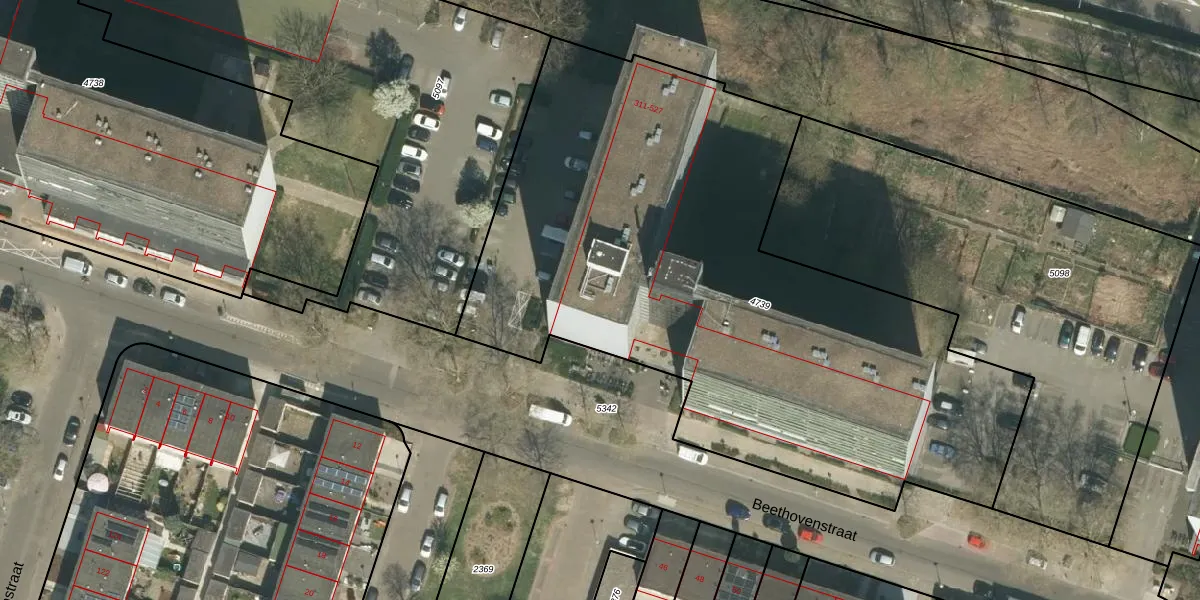 Het perceel waarop Beethovenstraat 351 staat heeft een oppervlakte van 3793 m². Dit is een zeer groot perceel. De perceeloppervlakte wordt geregistreerd door het Kadaster. Gedetailleerde informatie over de maten van dit perceel kunt u vinden in het rapport Kadastrale kaart met maatvoering van Beethovenstraat 351.