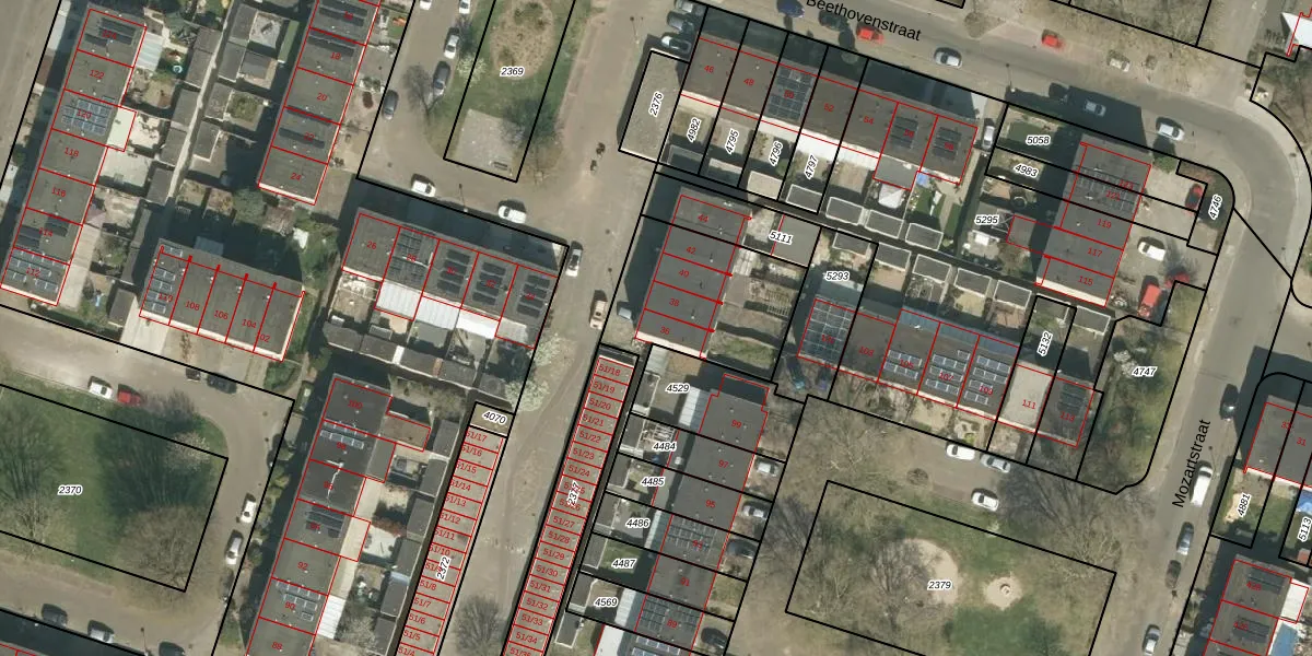 Het perceel waarop Beethovenstraat 36 staat heeft een oppervlakte van 3042 m². Dit is een zeer groot perceel. De perceeloppervlakte wordt geregistreerd door het Kadaster. Gedetailleerde informatie over de maten van dit perceel kunt u vinden in het rapport Kadastrale kaart met maatvoering van Beethovenstraat 36.