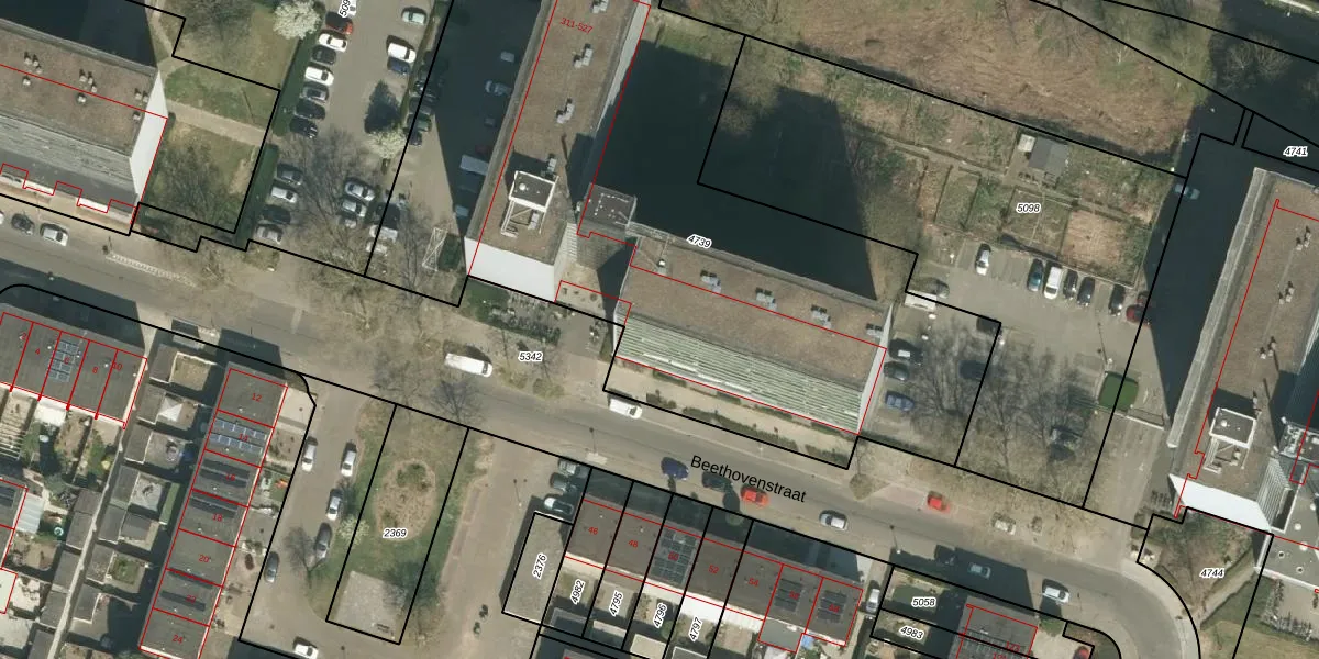Het perceel waarop Beethovenstraat 447 staat heeft een oppervlakte van 3793 m². Dit is een zeer groot perceel. De perceeloppervlakte wordt geregistreerd door het Kadaster. Gedetailleerde informatie over de maten van dit perceel kunt u vinden in het rapport Kadastrale kaart met maatvoering van Beethovenstraat 447.