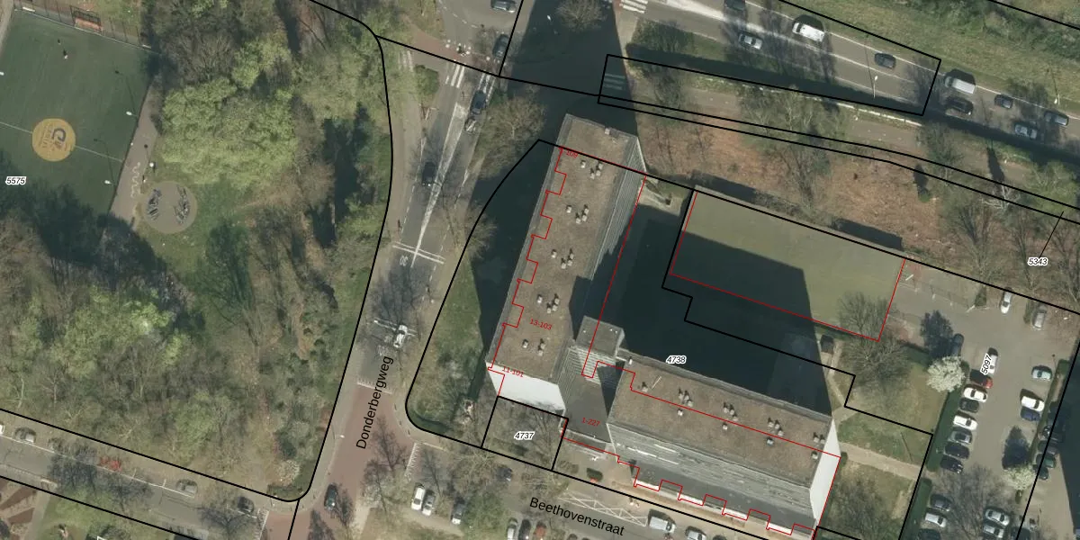Het perceel waarop Beethovenstraat 55 staat heeft een oppervlakte van 3741 m². Dit is een zeer groot perceel. De perceeloppervlakte wordt geregistreerd door het Kadaster. Gedetailleerde informatie over de maten van dit perceel kunt u vinden in het rapport Kadastrale kaart met maatvoering van Beethovenstraat 55.