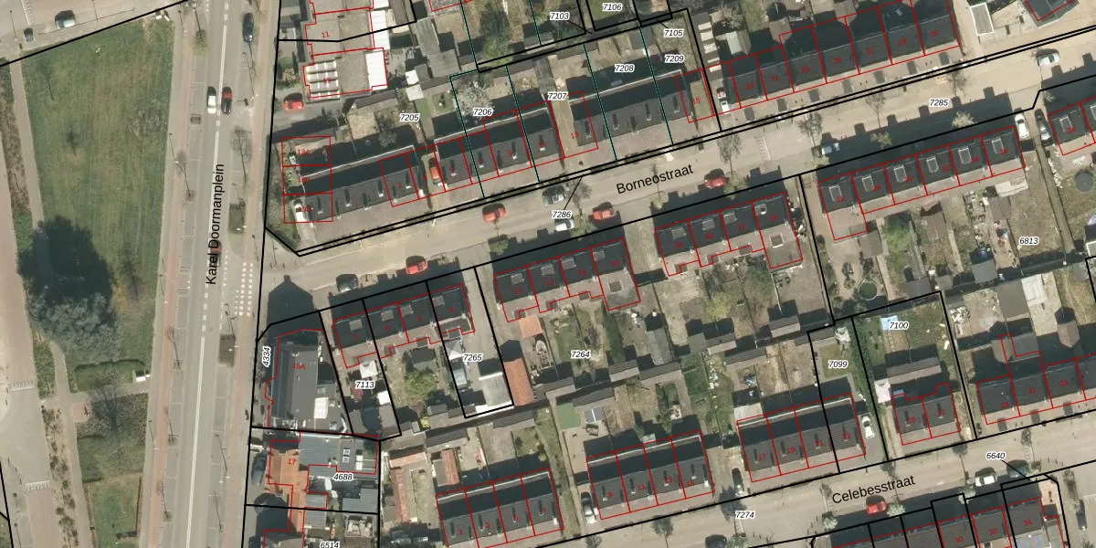 Het perceel waarop Borneostraat 12 staat heeft een oppervlakte van 4243 m². Dit is een zeer groot perceel. De perceeloppervlakte wordt geregistreerd door het Kadaster. Gedetailleerde informatie over de maten van dit perceel kunt u vinden in het rapport Kadastrale kaart met maatvoering van Borneostraat 12.