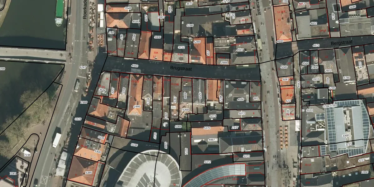 Brugstraat 11-B is gelegen op kadastraal perceel RMD00D4988. Deze kadastrale aanduiding is uniek en wordt gebruikt door het Kadaster om eigendomsrechten en andere zakelijke rechten vast te leggen. Het perceel maakt onderdeel uit van de kadastrale gemeente Roermond.