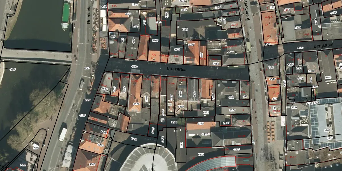 Brugstraat 13-B is gelegen op kadastraal perceel RMD00D5367. Deze kadastrale aanduiding is uniek en wordt gebruikt door het Kadaster om eigendomsrechten en andere zakelijke rechten vast te leggen. Het perceel maakt onderdeel uit van de kadastrale gemeente Roermond.