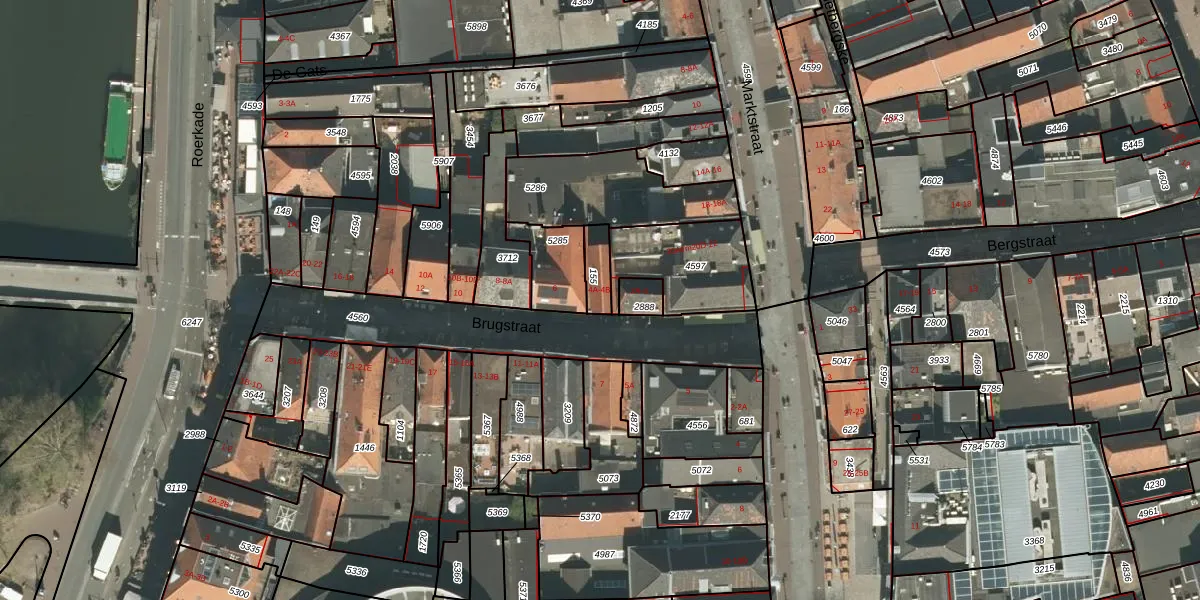 Brugstraat 4-A is gelegen op kadastraal perceel RMD00D155. Deze kadastrale aanduiding is uniek en wordt gebruikt door het Kadaster om eigendomsrechten en andere zakelijke rechten vast te leggen. Het perceel maakt onderdeel uit van de kadastrale gemeente Roermond.
