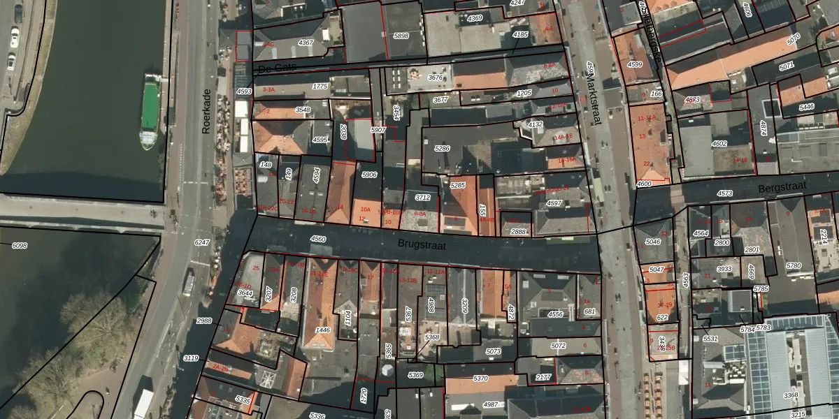 Brugstraat 8 is gelegen op kadastraal perceel RMD00D3712. Deze kadastrale aanduiding is uniek en wordt gebruikt door het Kadaster om eigendomsrechten en andere zakelijke rechten vast te leggen. Het perceel maakt onderdeel uit van de kadastrale gemeente Roermond.