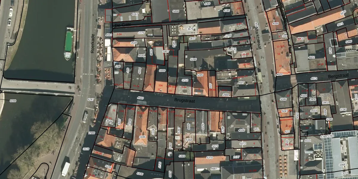 Brugstraat 8-A is gelegen op kadastraal perceel RMD00D3712. Deze kadastrale aanduiding is uniek en wordt gebruikt door het Kadaster om eigendomsrechten en andere zakelijke rechten vast te leggen. Het perceel maakt onderdeel uit van de kadastrale gemeente Roermond.