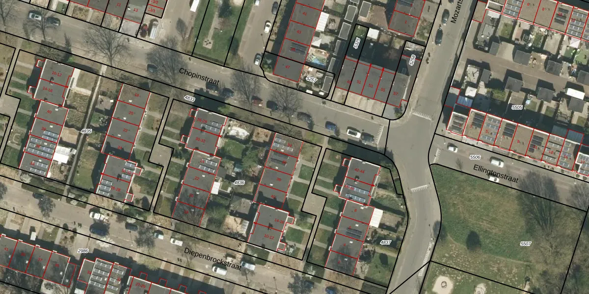Het perceel waarop Chopinstraat 34 staat heeft een oppervlakte van 2020 m². Dit is een zeer groot perceel. De perceeloppervlakte wordt geregistreerd door het Kadaster. Gedetailleerde informatie over de maten van dit perceel kunt u vinden in het rapport Kadastrale kaart met maatvoering van Chopinstraat 34.