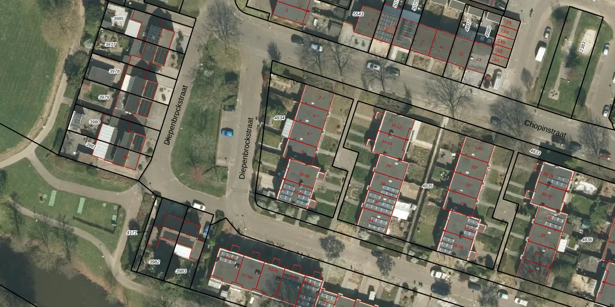 Het perceel waarop Chopinstraat 8 staat heeft een oppervlakte van 1043 m². Dit is een zeer groot perceel. De perceeloppervlakte wordt geregistreerd door het Kadaster. Gedetailleerde informatie over de maten van dit perceel kunt u vinden in het rapport Kadastrale kaart met maatvoering van Chopinstraat 8.