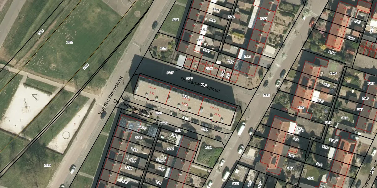 Het perceel waarop De Carpentierstraat 1-7 staat heeft een oppervlakte van 636 m². Dit is een groot perceel. De perceeloppervlakte wordt geregistreerd door het Kadaster. Gedetailleerde informatie over de maten van dit perceel kunt u vinden in het rapport Kadastrale kaart met maatvoering van De Carpentierstraat 1-7.