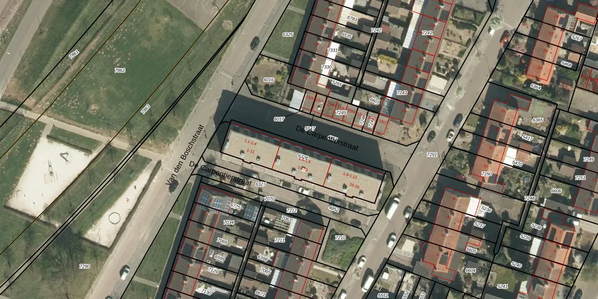 Het perceel waarop De Carpentierstraat 1-6 staat heeft een oppervlakte van 636 m². Dit is een groot perceel. De perceeloppervlakte wordt geregistreerd door het Kadaster. Gedetailleerde informatie over de maten van dit perceel kunt u vinden in het rapport Kadastrale kaart met maatvoering van De Carpentierstraat 1-6.