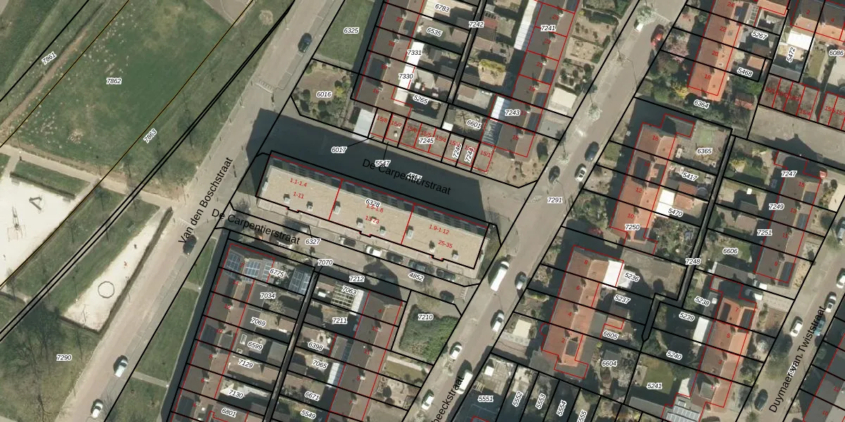 Het perceel waarop De Carpentierstraat 1-10 staat heeft een oppervlakte van 636 m². Dit is een groot perceel. De perceeloppervlakte wordt geregistreerd door het Kadaster. Gedetailleerde informatie over de maten van dit perceel kunt u vinden in het rapport Kadastrale kaart met maatvoering van De Carpentierstraat 1-10.