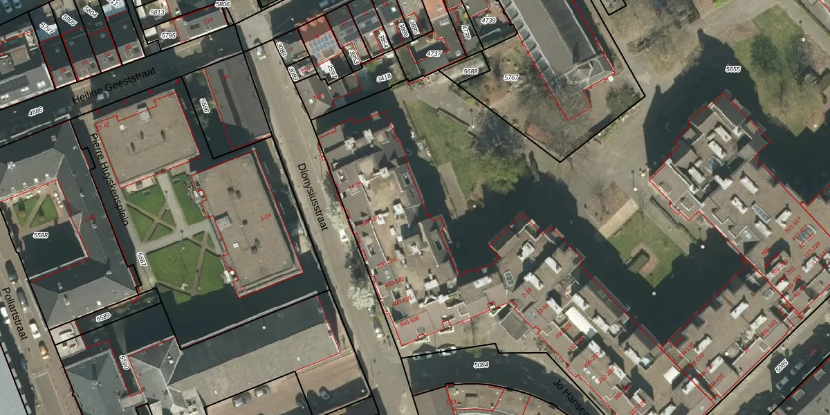 Dionysiusstraat 100 is gelegen op kadastraal perceel RMD00D5655. Deze kadastrale aanduiding is uniek en wordt gebruikt door het Kadaster om eigendomsrechten en andere zakelijke rechten vast te leggen. Het perceel maakt onderdeel uit van de kadastrale gemeente Roermond.