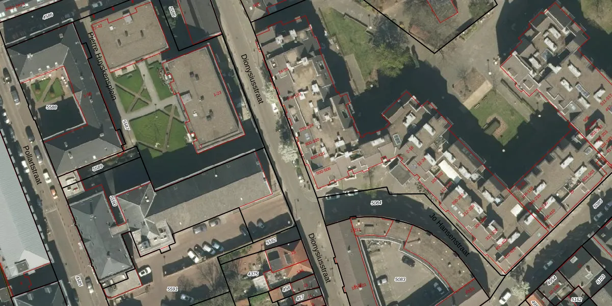 Het perceel waarop Dionysiusstraat 16 staat heeft een oppervlakte van 1,3 ha. Dit is een zeer groot perceel. De perceeloppervlakte wordt geregistreerd door het Kadaster. Gedetailleerde informatie over de maten van dit perceel kunt u vinden in het rapport Kadastrale kaart met maatvoering van Dionysiusstraat 16.