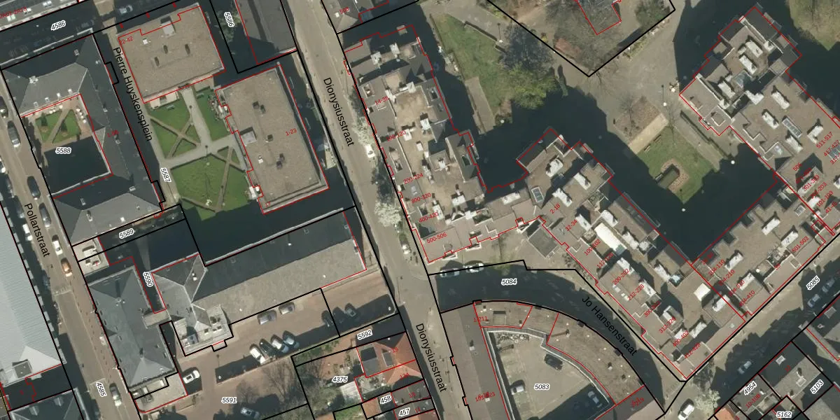 Dionysiusstraat 214 is gelegen op kadastraal perceel RMD00D5655. Deze kadastrale aanduiding is uniek en wordt gebruikt door het Kadaster om eigendomsrechten en andere zakelijke rechten vast te leggen. Het perceel maakt onderdeel uit van de kadastrale gemeente Roermond.