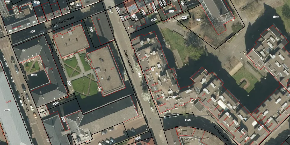 Het perceel waarop Dionysiusstraat 38 staat heeft een oppervlakte van 1,3 ha. Dit is een zeer groot perceel. De perceeloppervlakte wordt geregistreerd door het Kadaster. Gedetailleerde informatie over de maten van dit perceel kunt u vinden in het rapport Kadastrale kaart met maatvoering van Dionysiusstraat 38.