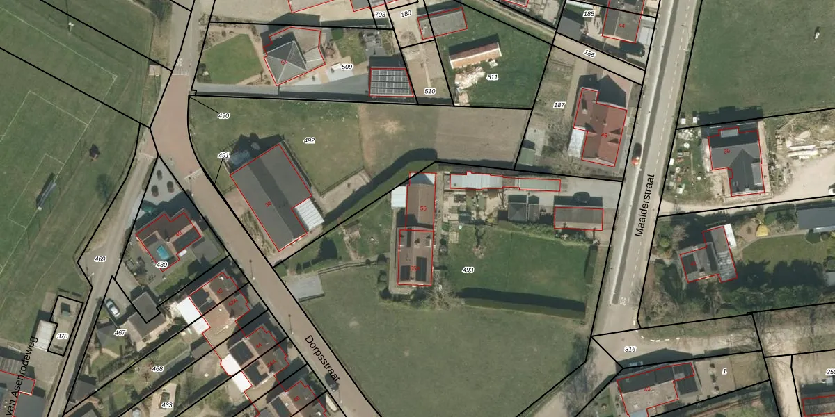 Dorpsstraat 55 is gelegen op kadastraal perceel RMD00L493. Deze kadastrale aanduiding is uniek en wordt gebruikt door het Kadaster om eigendomsrechten en andere zakelijke rechten vast te leggen. Het perceel maakt onderdeel uit van de kadastrale gemeente Roermond.