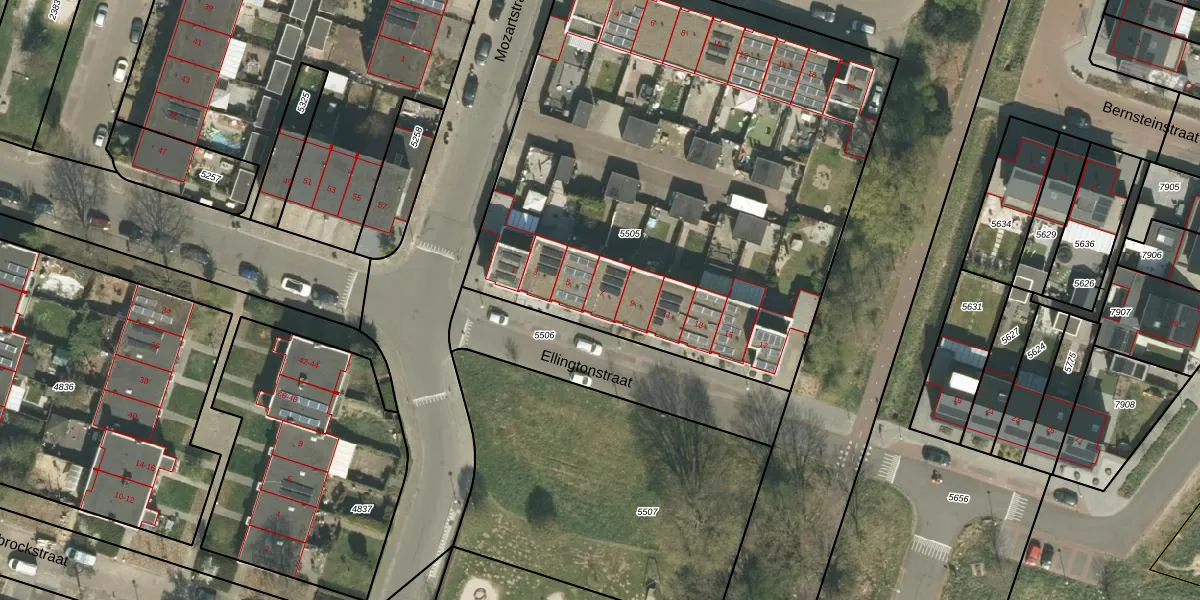 Ellingtonstraat 7 is gelegen op kadastraal perceel RMD00F5505. Deze kadastrale aanduiding is uniek en wordt gebruikt door het Kadaster om eigendomsrechten en andere zakelijke rechten vast te leggen. Het perceel maakt onderdeel uit van de kadastrale gemeente Roermond.