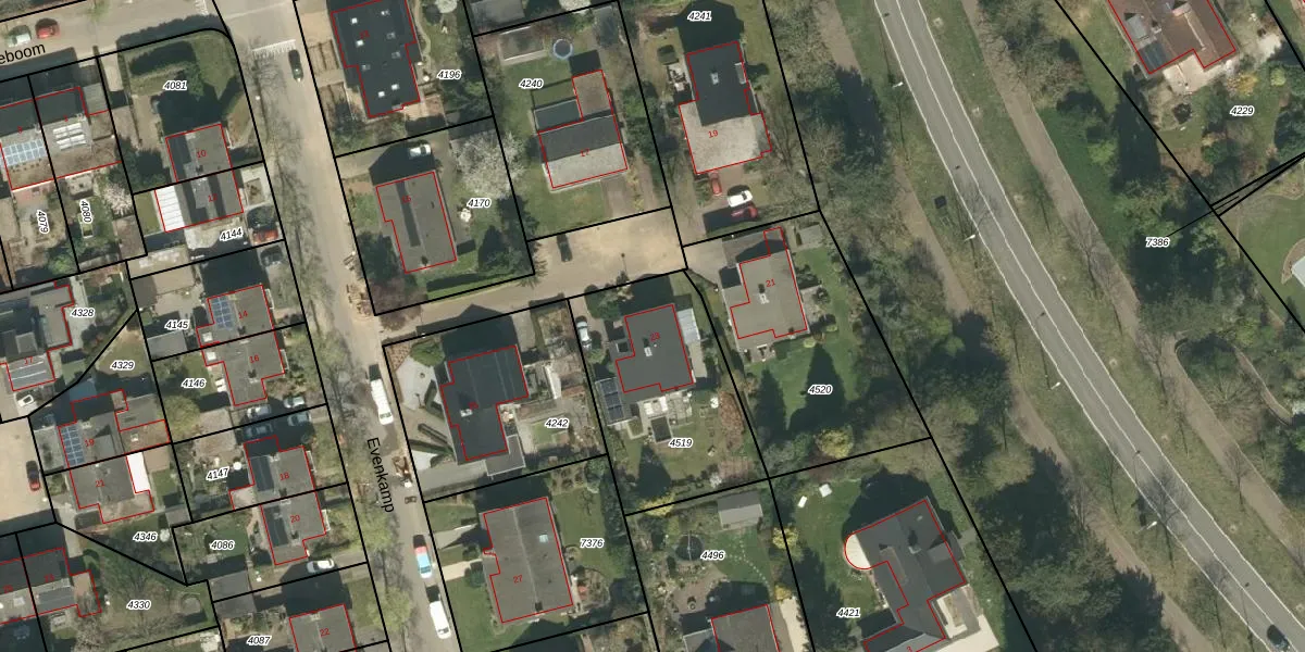 Het perceel waarop Evenkamp 23 staat heeft een oppervlakte van 730 m². Dit is een groot perceel. De perceeloppervlakte wordt geregistreerd door het Kadaster. Gedetailleerde informatie over de maten van dit perceel kunt u vinden in het rapport Kadastrale kaart met maatvoering van Evenkamp 23.