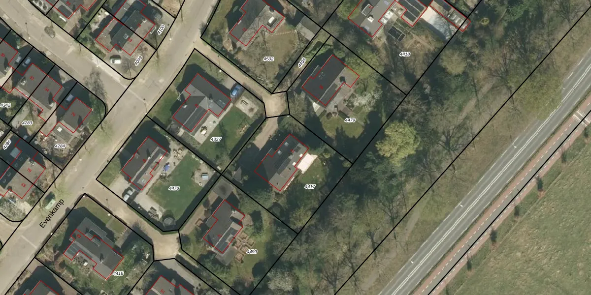 Het perceel waarop Evenkamp 41 staat heeft een oppervlakte van 965 m². Dit is een groot perceel. De perceeloppervlakte wordt geregistreerd door het Kadaster. Gedetailleerde informatie over de maten van dit perceel kunt u vinden in het rapport Kadastrale kaart met maatvoering van Evenkamp 41.