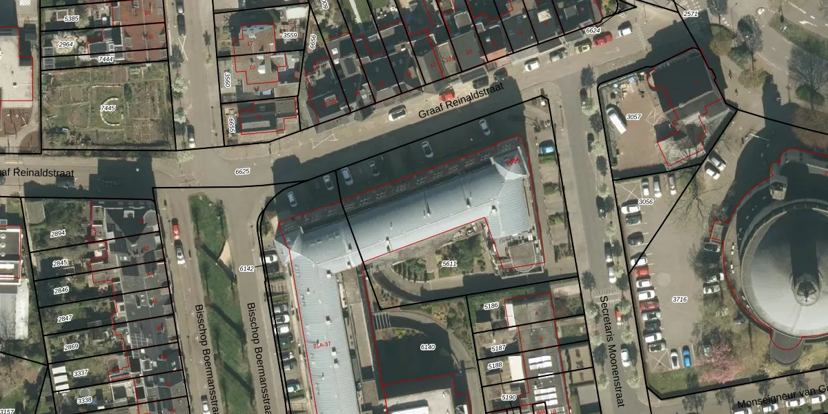 Het perceel waarop Graaf Reinaldstraat 25 staat heeft een oppervlakte van 2055 m². Dit is een zeer groot perceel. De perceeloppervlakte wordt geregistreerd door het Kadaster. Gedetailleerde informatie over de maten van dit perceel kunt u vinden in het rapport Kadastrale kaart met maatvoering van Graaf Reinaldstraat 25.