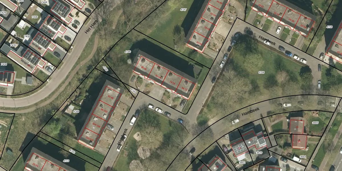 Het perceel waarop Hambeek 76 staat heeft een oppervlakte van 1660 m². Dit is een zeer groot perceel. De perceeloppervlakte wordt geregistreerd door het Kadaster. Gedetailleerde informatie over de maten van dit perceel kunt u vinden in het rapport Kadastrale kaart met maatvoering van Hambeek 76.