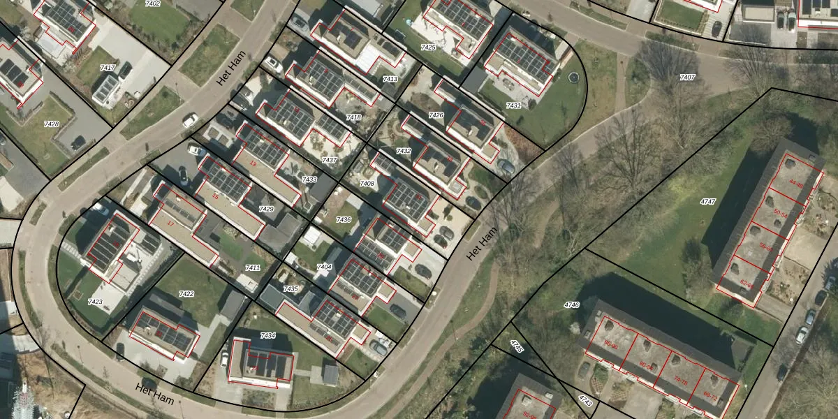 Het perceel waarop Het Ham 31 staat heeft een oppervlakte van 369 m². Dit is een groot perceel. De perceeloppervlakte wordt geregistreerd door het Kadaster. Gedetailleerde informatie over de maten van dit perceel kunt u vinden in het rapport Kadastrale kaart met maatvoering van Het Ham 31.