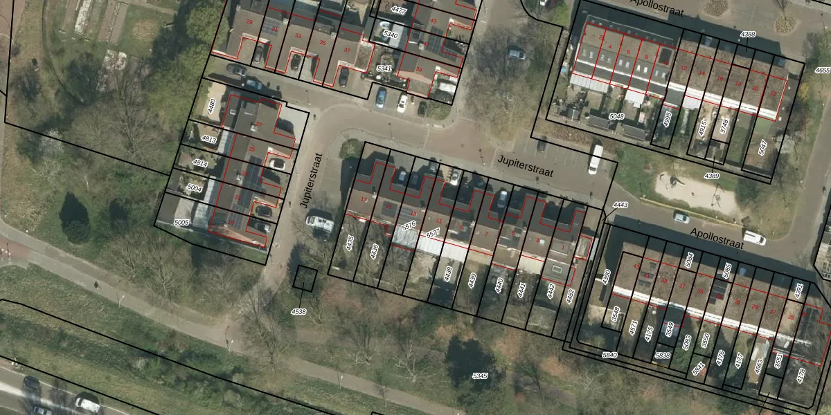 Jupiterstraat 13 is gelegen op kadastraal perceel RMD00F5576. Deze kadastrale aanduiding is uniek en wordt gebruikt door het Kadaster om eigendomsrechten en andere zakelijke rechten vast te leggen. Het perceel maakt onderdeel uit van de kadastrale gemeente Roermond.