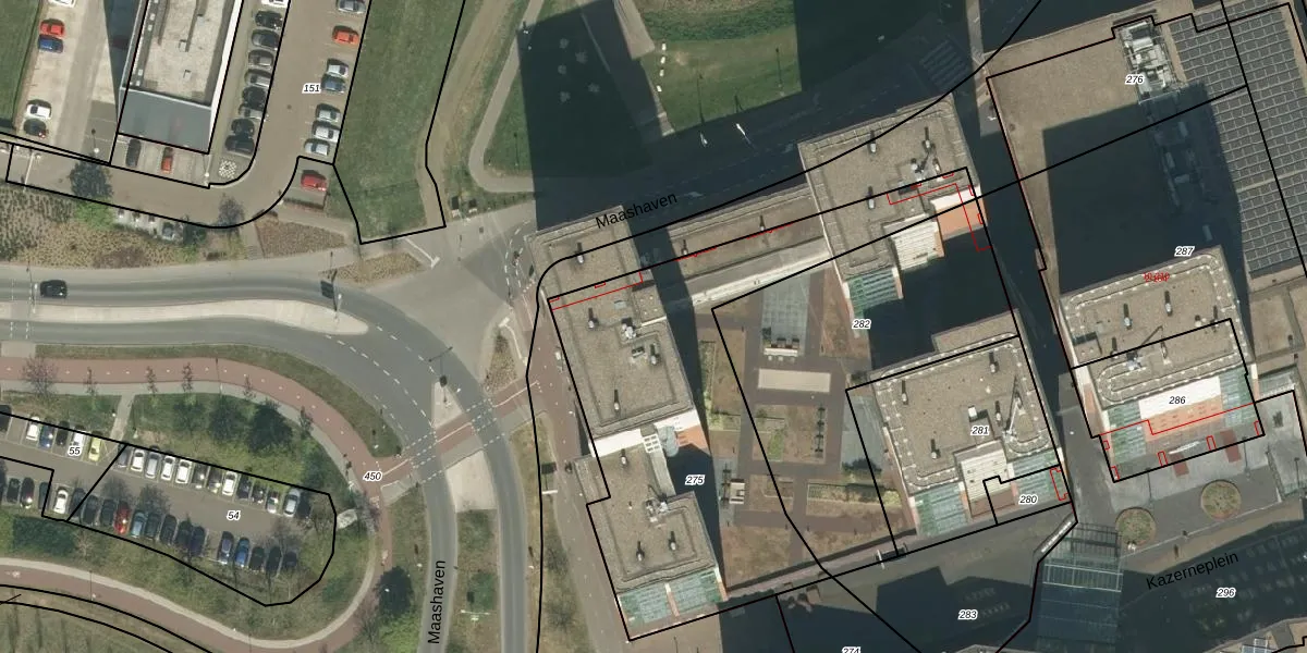 Maashaven 102 is gelegen op kadastraal perceel RMD00K275. Deze kadastrale aanduiding is uniek en wordt gebruikt door het Kadaster om eigendomsrechten en andere zakelijke rechten vast te leggen. Het perceel maakt onderdeel uit van de kadastrale gemeente Roermond.