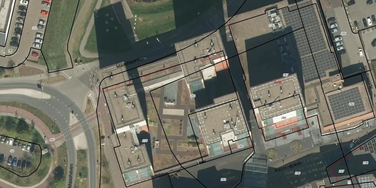 Het perceel waarop Maashaven 170 staat heeft een oppervlakte van 1237 m². Dit is een zeer groot perceel. De perceeloppervlakte wordt geregistreerd door het Kadaster. Gedetailleerde informatie over de maten van dit perceel kunt u vinden in het rapport Kadastrale kaart met maatvoering van Maashaven 170.