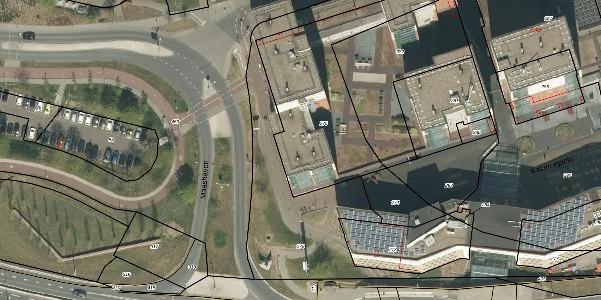 Het perceel waarop Maashaven 38 staat heeft een oppervlakte van 1707 m². Dit is een zeer groot perceel. De perceeloppervlakte wordt geregistreerd door het Kadaster. Gedetailleerde informatie over de maten van dit perceel kunt u vinden in het rapport Kadastrale kaart met maatvoering van Maashaven 38.