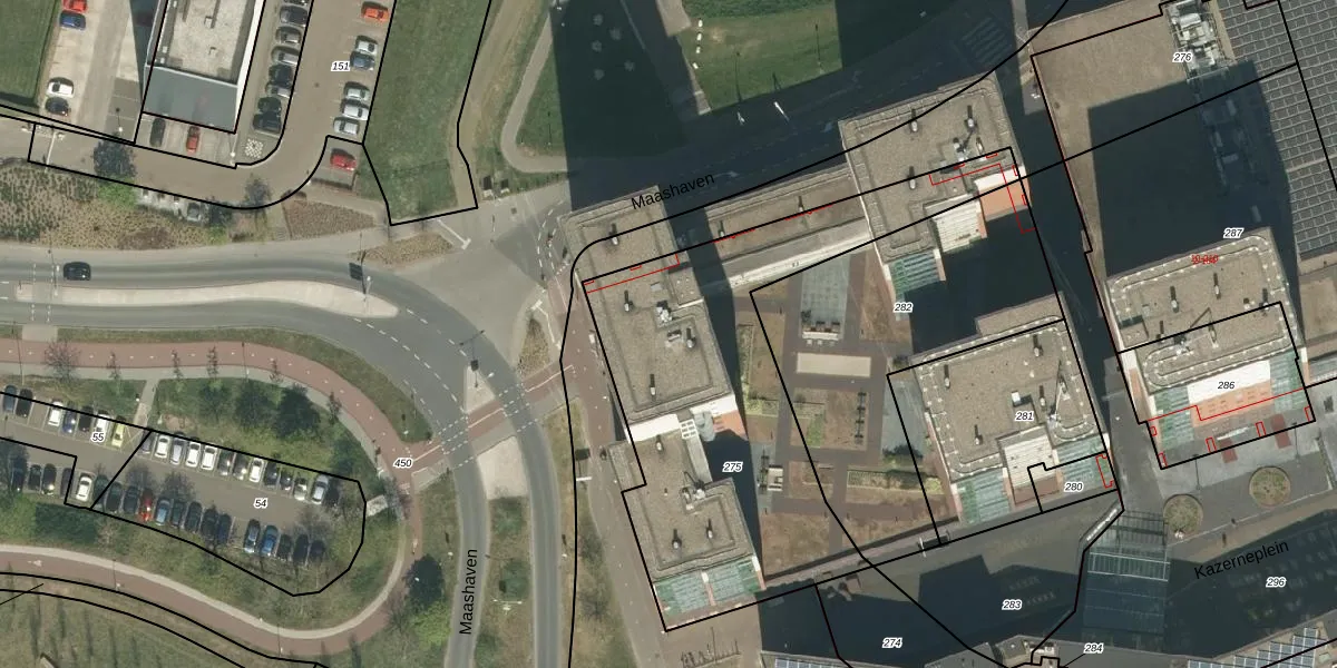 Maashaven 90 is gelegen op kadastraal perceel RMD00K275. Deze kadastrale aanduiding is uniek en wordt gebruikt door het Kadaster om eigendomsrechten en andere zakelijke rechten vast te leggen. Het perceel maakt onderdeel uit van de kadastrale gemeente Roermond.