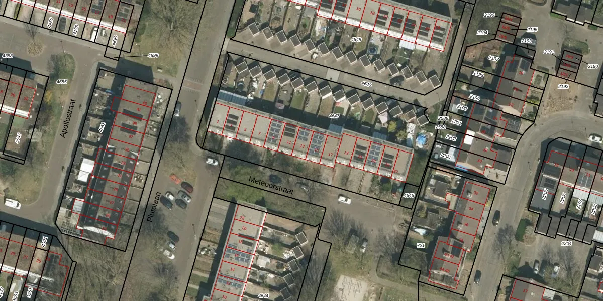 Het perceel waarop Meteoorstraat 13 staat heeft een oppervlakte van 2405 m². Dit is een zeer groot perceel. De perceeloppervlakte wordt geregistreerd door het Kadaster. Gedetailleerde informatie over de maten van dit perceel kunt u vinden in het rapport Kadastrale kaart met maatvoering van Meteoorstraat 13.