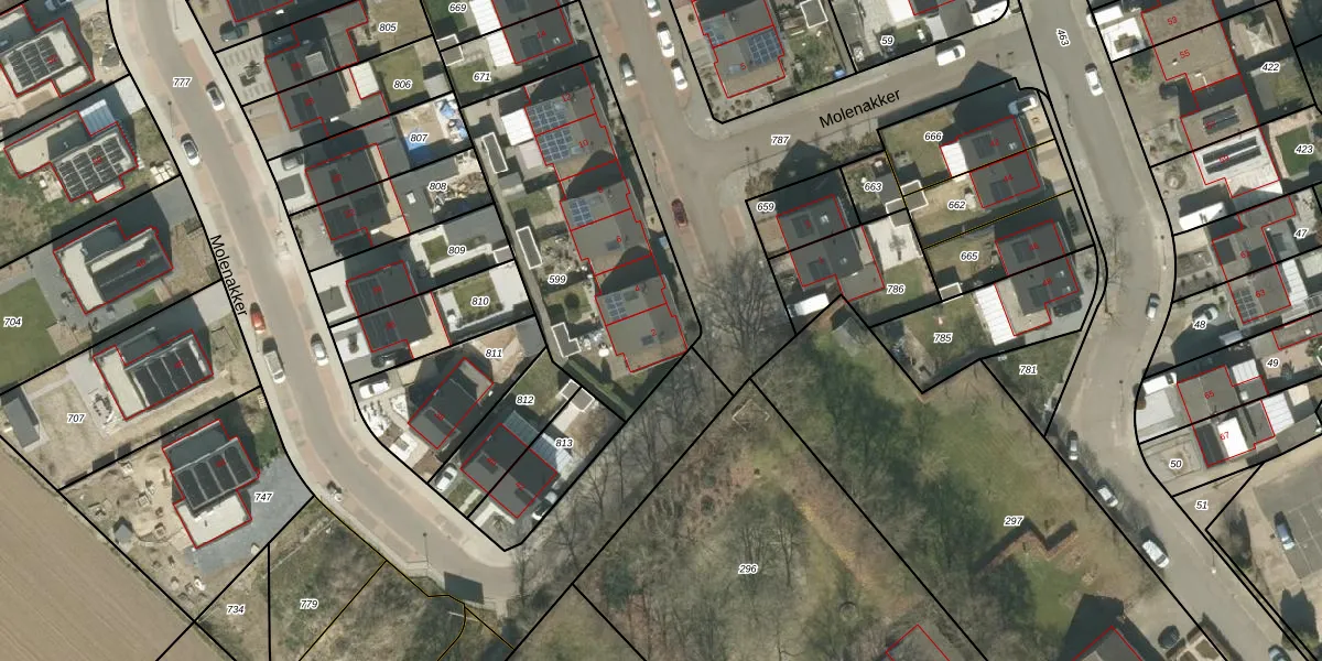 Molenakker 2 is gelegen op kadastraal perceel RMD00L599. Deze kadastrale aanduiding is uniek en wordt gebruikt door het Kadaster om eigendomsrechten en andere zakelijke rechten vast te leggen. Het perceel maakt onderdeel uit van de kadastrale gemeente Roermond.